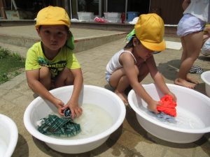 片付け時は、汚れた服を自分で洗い洗濯ごっこが始まります。汚れた物をどうしたらきれいになるか自ら考え、主体的に行動する力が育まれています。